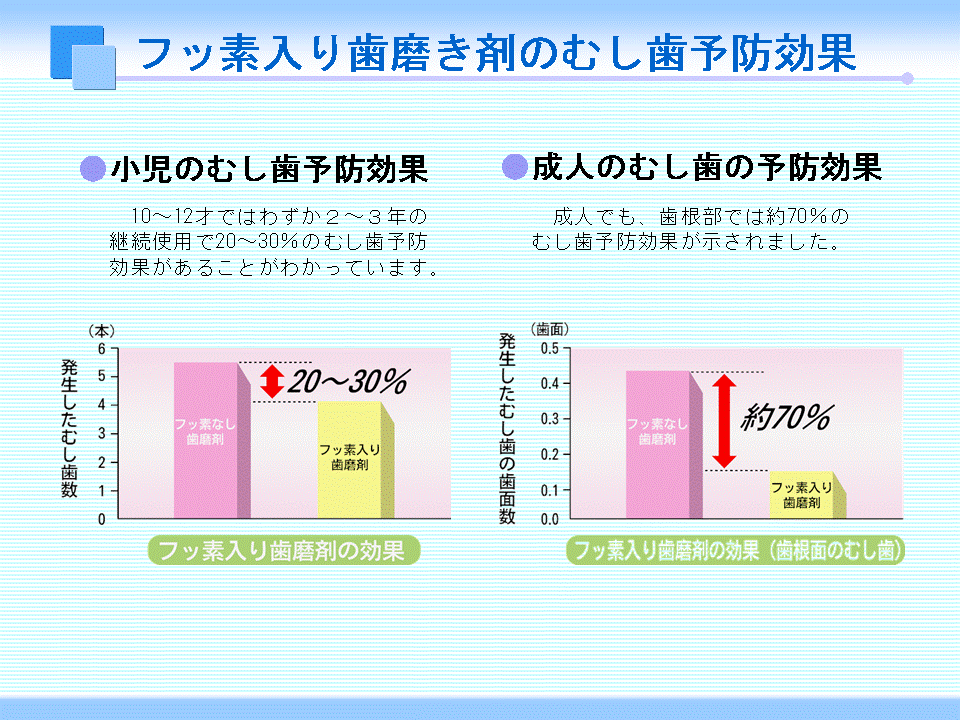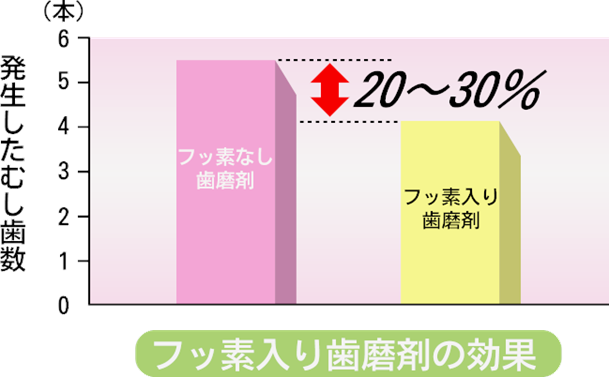 小児では、フッ素入り歯みがき剤を継続使用することで、発生したむし歯数が20~30%(むし歯の本数として)減少させることができます。
