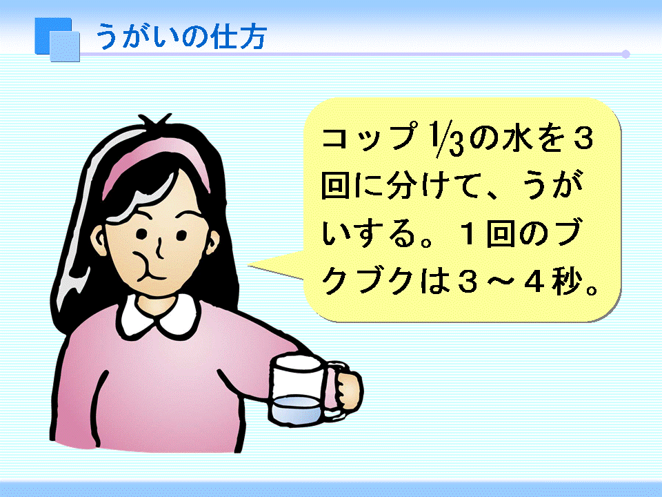 うがいをしすぎてしまうと、お口の中に保持されるフッ素が減ってしまいます。フッ素入り歯みがき剤使用後の過度のうがいは避けましょう。1回のうがいは、約25㏄の水で3~4秒程度です。