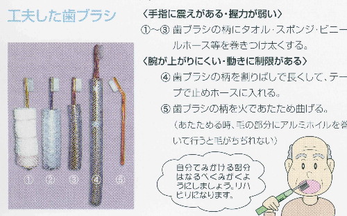 また、身近な割り箸やホース、梱包材を活用した工夫歯ブラシの作り方は当協会発行の、お口のお手入れの手びき に掲載されておりますので、ぜひご覧下さい。